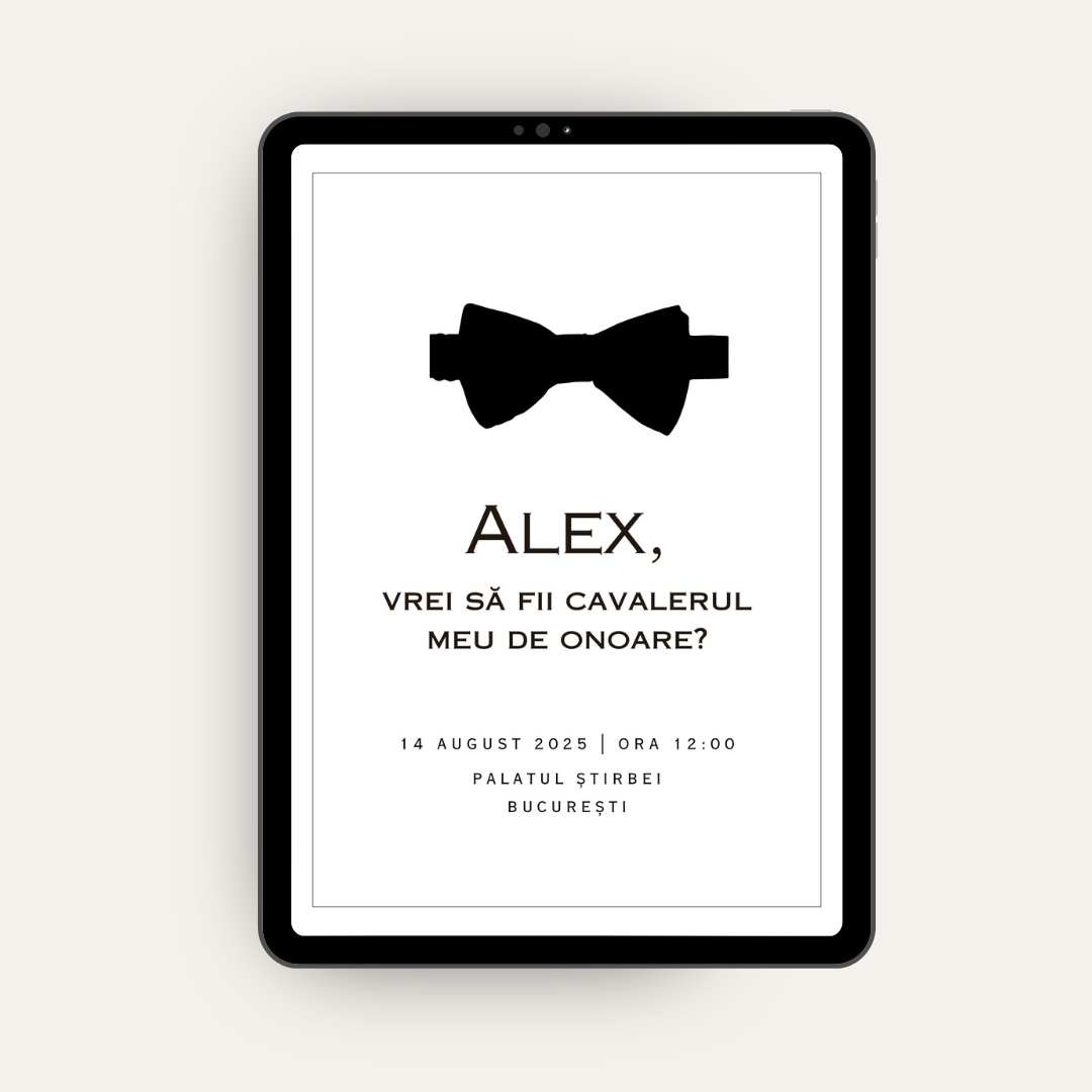 💌 Plătești o singură invitație, iar noi realizăm o invitație personalizată pentru fiecare cavaler de onoare (pe baza numelor pe care le scrii în formular);
